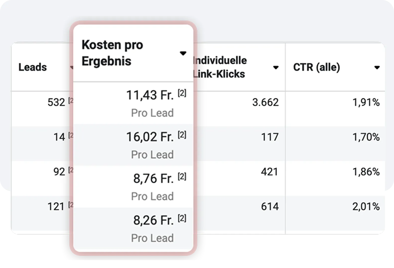 Die besten Resultate entstehen durch jahrelange Erfahrung. Diese spiegelt sich in unserem Know-how wider und besteht aus über 5.500 umgesetzten Werbeanzeigen sowie unserer tiefen Media Buying & Video-Framework-Expertise.